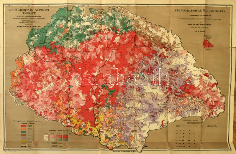 1919 Bp., Magyarország néprajzi térképe, tervezete: Móricz Miklós Dr., szerk: Kogutowicz Károly Dr., kiadja: Magyar Földrajzi Intézet, 1:1 000 000, kis szakadásokkal, 58×89 cm