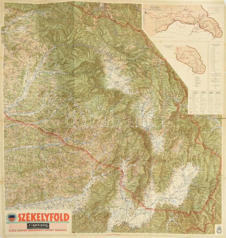 1942 Székelyföld Térképe, M. Kir. Honvéd Térképészeti Intézet, jobb felső sarkában külön kis térképekkel (közlekedés, gyógyhelyek),1:200.000, részben javított kisebb szakadásokkal, 100x84 cm