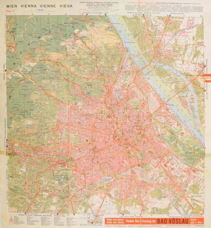 Beschreibung: Bécs városának, valamint kulturális intézményeinek, nevezetességeinek térképe, kétoldalas, kissé sérült, ragasztott, 64x59 cm