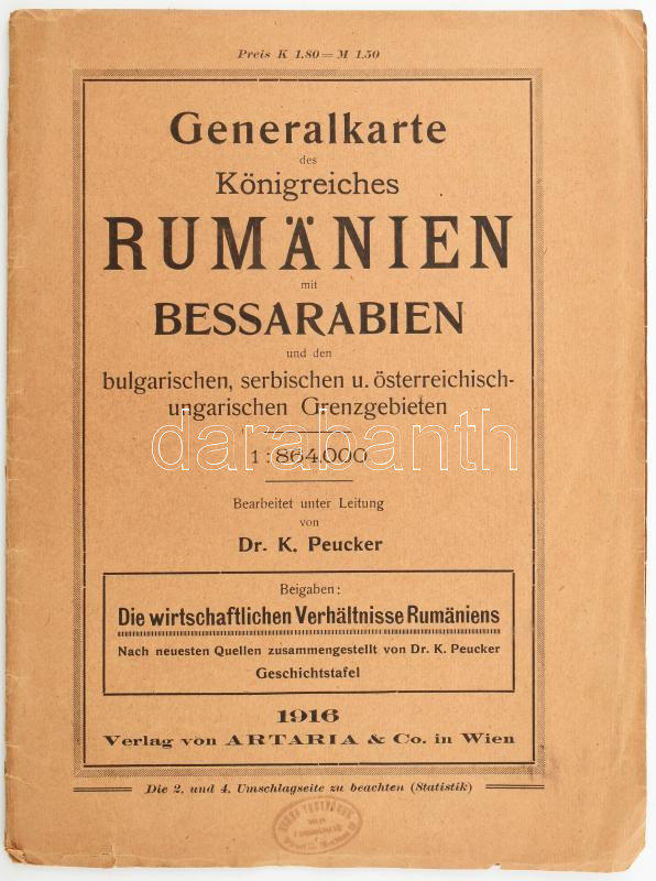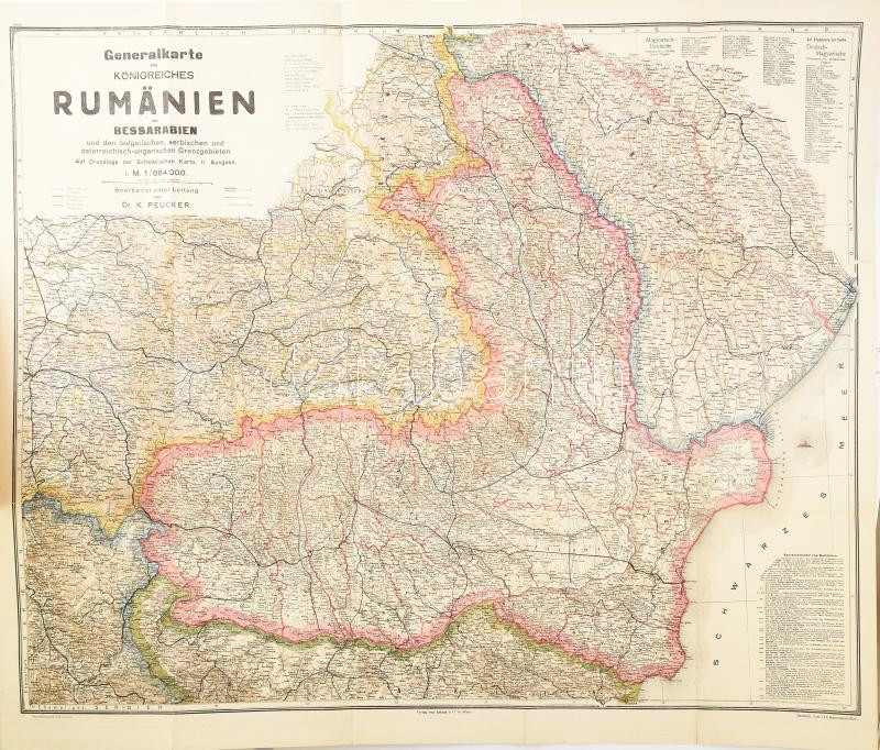 Generalkarte des Königreiches Rumänien mit Bessarabien und den bulgarischen, serbischen u. österreichisch-ungarischen Grenzgebieten 1:864.000. Dr. K. Peucker. 1916. Artaria. Papírborítóval 95x74 cm