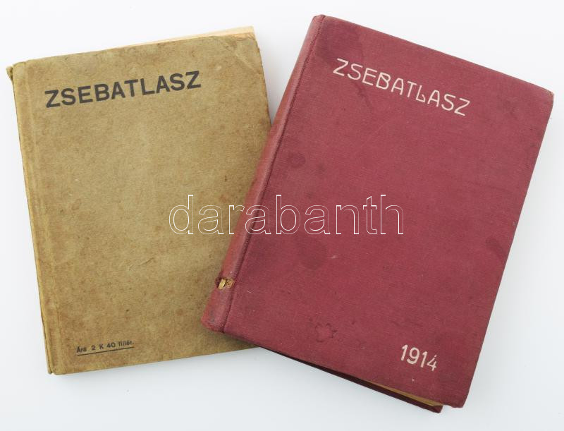 Zsebatlasz naptárral és statisztikai adatokkal az 1914. évre. Szerk.: Kugotwicz Károly és Hermann Győző. Bp., 1913, Magyar Földrajzi Intézet Rt., 256 p. Kiadói egészvászon-kötés, kissé kopott, foltos borítóval, a gerincen kis sérüléssel. + Zsebatlasz naptárral és statisztikai adatokkal az 1915. évre. Szerk.: Kugotwicz Károly és Bátky Zsigmond. Bp., 1914, Magyar Földrajzi Intézet Rt., 64 p. + 2 (kihajtható térképek: Szerbia háború térképe, Páris és környéke) t. Kiadói papírkötés, foltos, kopott borítóval, kissé sérült gerinccel, csak 2 térképpel, az egyik térkép kijár, a másikon szakadás.