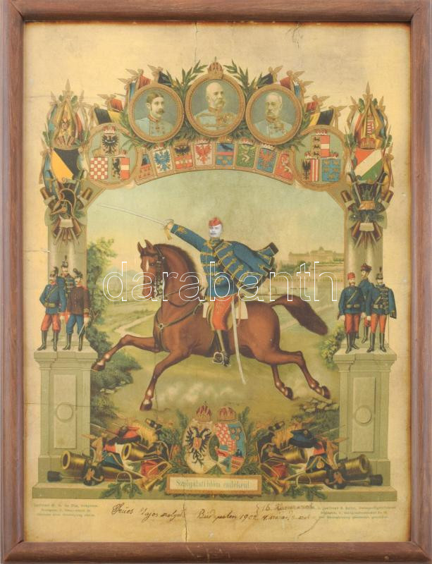 1902 Szolgálati időm emlékéül. Litografált emléklap üvegezett keretben... https://www.darabanth.com/de/472-Fernauktion/472.0/Kunst-Dokumente-andere-Sammelgebiete/Militaria~500008/1902-Szolgalati-idom-emlekeul-Litografalt-emleklap-uvegezett-keretben-42x53-cm~II3193713