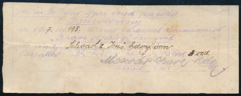 1917 Igazolvány bronz vitézségi éremről Schvartz Jenő hdvpj. őrm. részére, M. kir. 10. honv. gyal. ezred parság, Mozsár Imre hdgy. aláírásával, hajtott 10,7x 4 cm