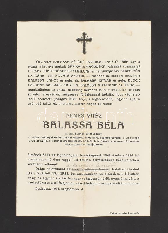 1924 vitéz Balassa Béla m. kir. honvéd altábornagy halálozási értesítő... https://www.darabanth.com/de/472-Fernauktion/472.0/Kunst-Dokumente-andere-Sammelgebiete/Militaria~500008/1924-vitez-Balassa-Bela-m-kir-honved-altabornagy-halalozasi-ertesitoje~II3194965