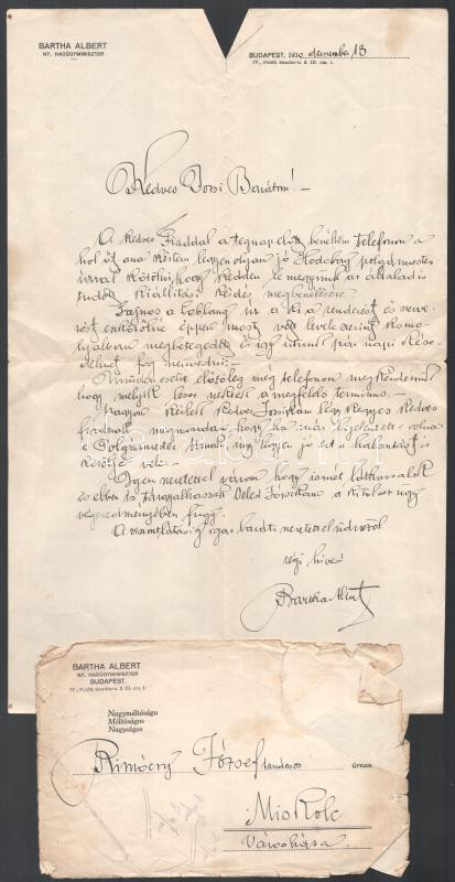 Beschreibung: 1930 Bartha Albert (1877-1960): katonatiszt, honvédelmi miniszter.autográf levele és levélborítéka