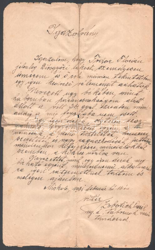 1931 Miskolc, Igazolvány Fodor Flórián jelenleg diósgyőri lakos, volt 34. gyal. ezred katona részére, vitéz Lobotich Emil ny. d. tábornok, vezér, tanácsnok saját kezű ajánlása mindennemű alkalmazásra, ragasztott 21,5x34 cm