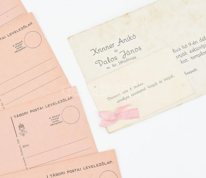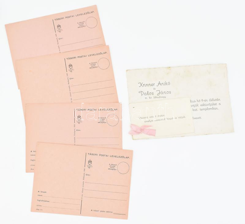 Beschreibung: 1944 Dalos János m. kir. főhadnagy, későbbi százados és alezredes esküvői meghívója + 4 db kitöltetlen tábori postai levelezőlap