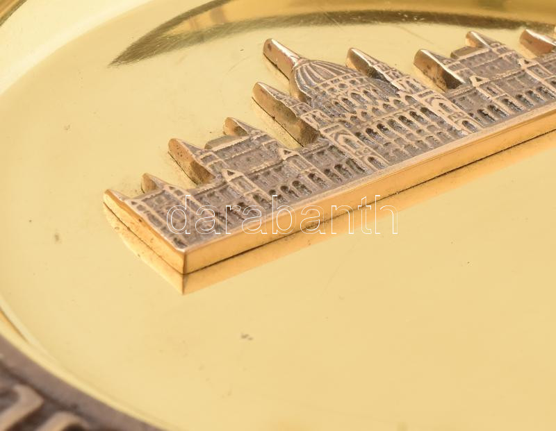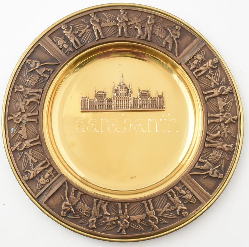 Beschreibung: Katonai réz dísztál, a Parlament ábrázolásával, kopással, d: 24 cm