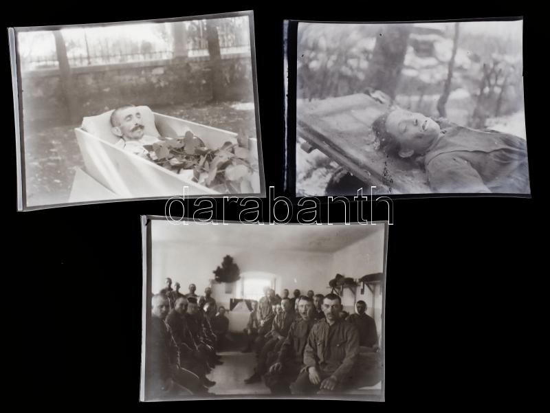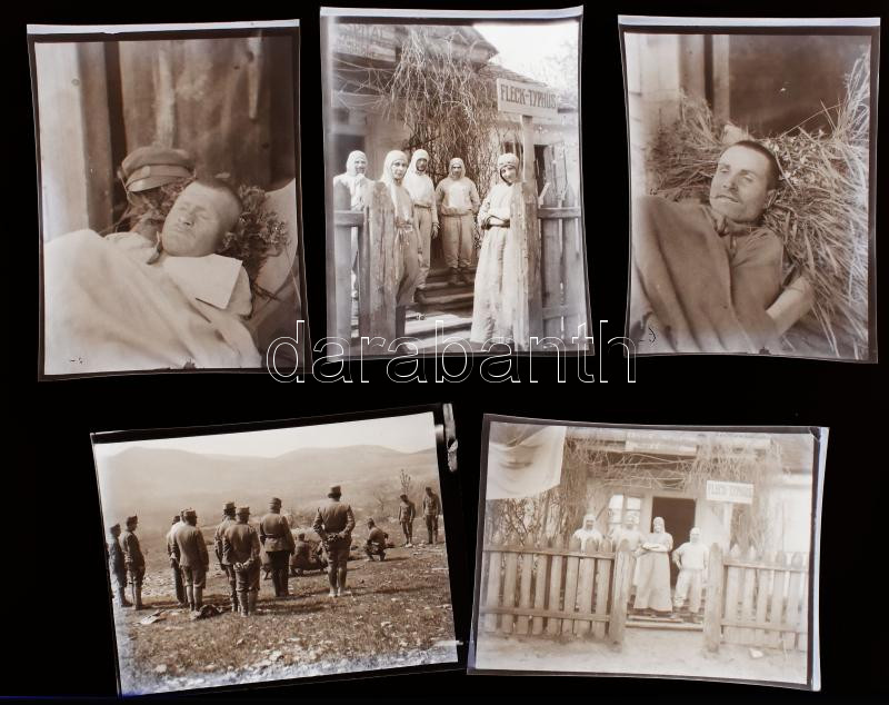 cca 1914-18 I. világháború, katonai frontkórház Fleck- Typhus (tífusz) táblával, holttestek, ritka felvételek, 8 db negatív és 2 db üvegnegatív, 8x10,5 és 9x12 cm