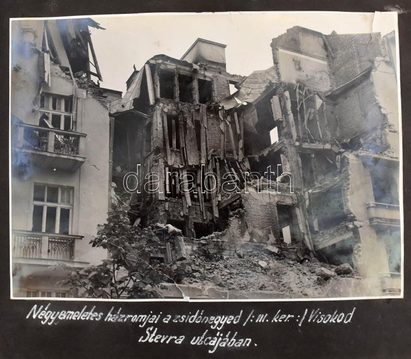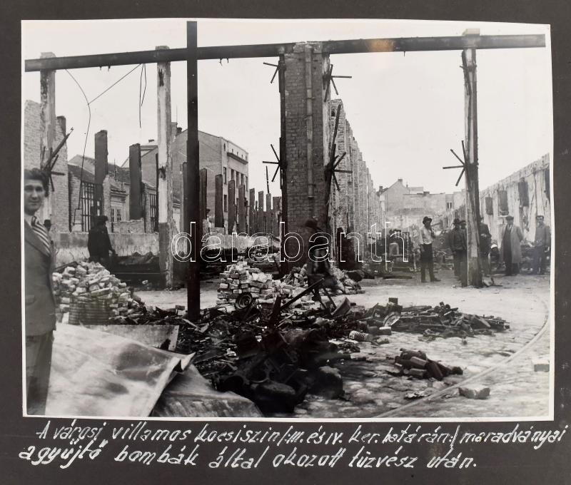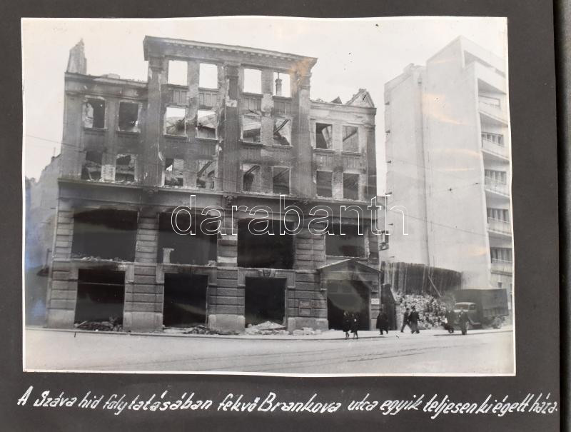 cca 1944 II. világháborús fotóalbum, a Magyarország és a tengelyhatalmak által megszállt szerb területeket (Belgrád és környéke) ért háborús pusztítást dokumentáló képekkel (feltehetőleg az 1944. áprilisi szövetséges bombázást követően készültek): Belgrád főpályaudvar, a zsidónegyed romos épületei, a magyar követség épülete (amely sértetlen maradt), romeltakarítási munkát végző szerb hadifoglyok, a felrobbantott Újvidék-Pétervárad híd roncsai, stb. Összesen 44 db nagyméretű (23,5x17,5 cm), az albumlapokra beragasztott, fekete-fehér fotóval, a képek alatt részletes feliratozással. Korabeli, fekete vászonborítású albumban, hullámos lapokkal, egy-két fotó sérült, néhány lapról a kép hiányzik. 25x31 cm. Értékes kordokumentum!