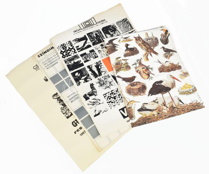 4 db plakát: Gulyás Dénes festőművész kiállítása, Csepel Galéria 1987; Színdinamika Tervezés, BME é.n. (cca 1980-85); Vizaulart Alkotóközösség Kiállítása, 1984; Gondoskodó, szabad önkormányzatokat, SZDSZ, é.n. (cca 1990-98); 58x40 és 70x50 cm közötti méretekben, feltekerve, részben hajtásnyommal, egyiken lapszéli elszíneződéssel