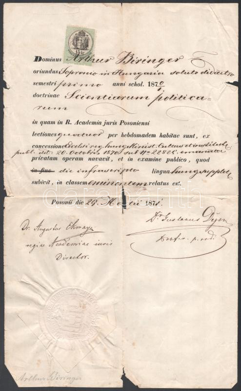 Beschreibung: 1871 Ekmayer Ágost, (1833-1905), (jogakadémiai igazgató-tanár) és Degen Gusztáv (1834-1903) író aláírásával ellátott pozsonyi bizonyítvány