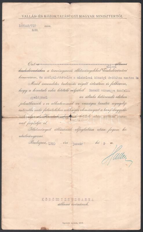Beschreibung: 1920 Bp., Haller István(1880-1964) vallás- és közoktatásügyi miniszter által aláírt kinevezés óvónő részére