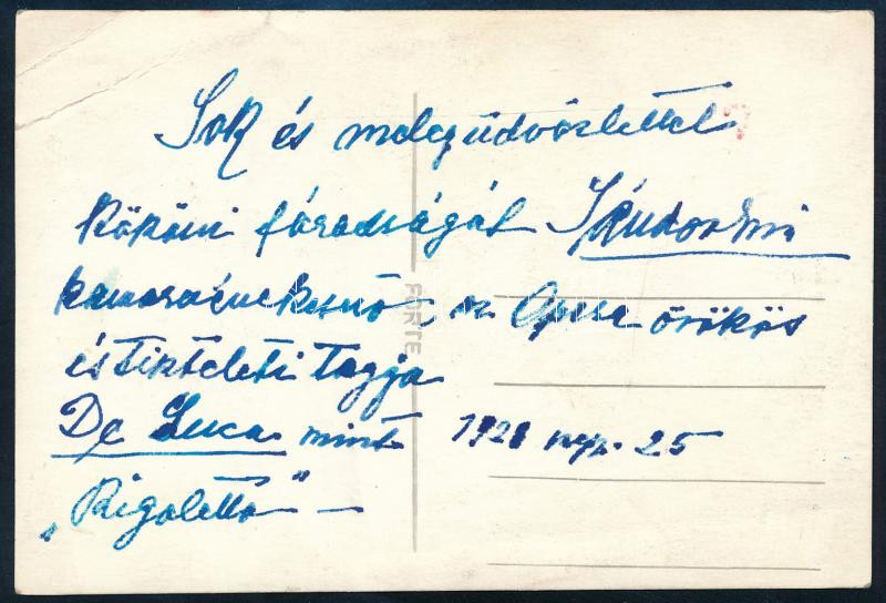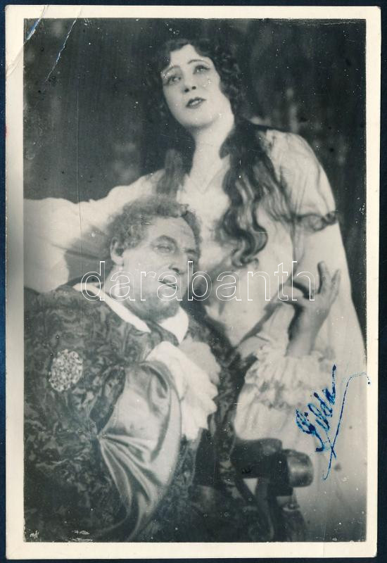 1928 Sándor Erzsi (1883-1962) opera-énekesnő, az első magyar császári és királyi kamaraénekesnő saját kézzel írt üdvözlő sorai, aláírással, egy őt ábrázoló képeslap hátoldalán, a sarkán törésnyomokkal.