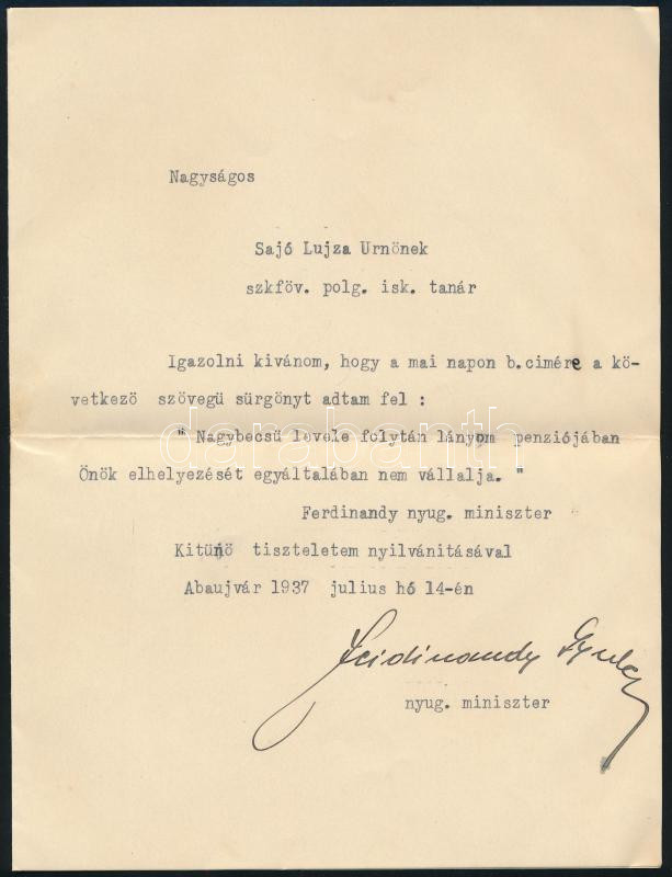 1937 Ferdinándy Gyula volt igazságügyminiszter aláírása levélen https://www.darabanth.com/de/472-Fernauktion/472.0/Kunst-Dokumente-andere-Sammelgebiete/Signatur~1000023/1937-Ferdinandy-Gyula-volt-igazsagugyminiszter-alairasa-levelen~II3195453