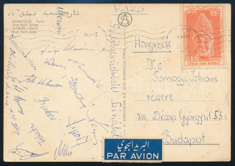 Beschreibung: 1953 A BHSE (Honvéd) labdarúgó csapat tagjainak aláírásai Szíriából: Kocsi, Bicskei, Kerekes, stb / Hungarian football team autograph postcard