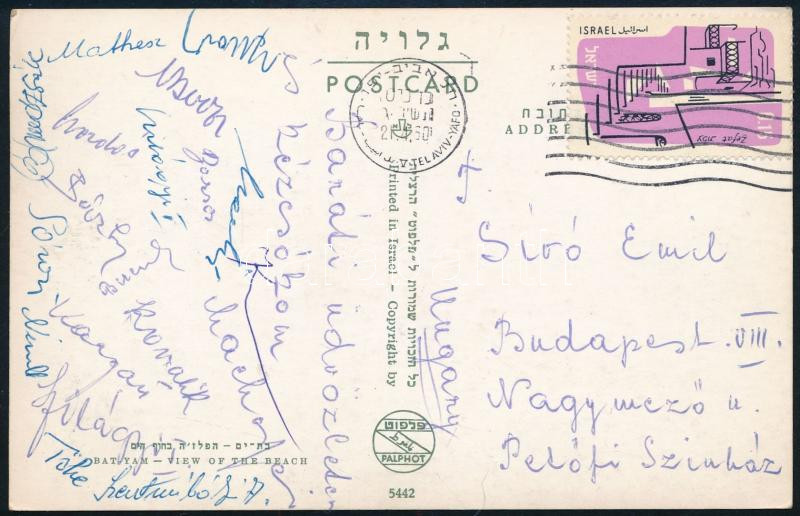 1960 Az MTK bajnok labdarúgócsapatának tagjainak autográf aláírással ellátott képeslapja Izraelből. Lantos, Kovalik, Sárosi, Mthesz, Szilágyi , stb / Autograph signed postcard of the Hungarian Champion MTK football team