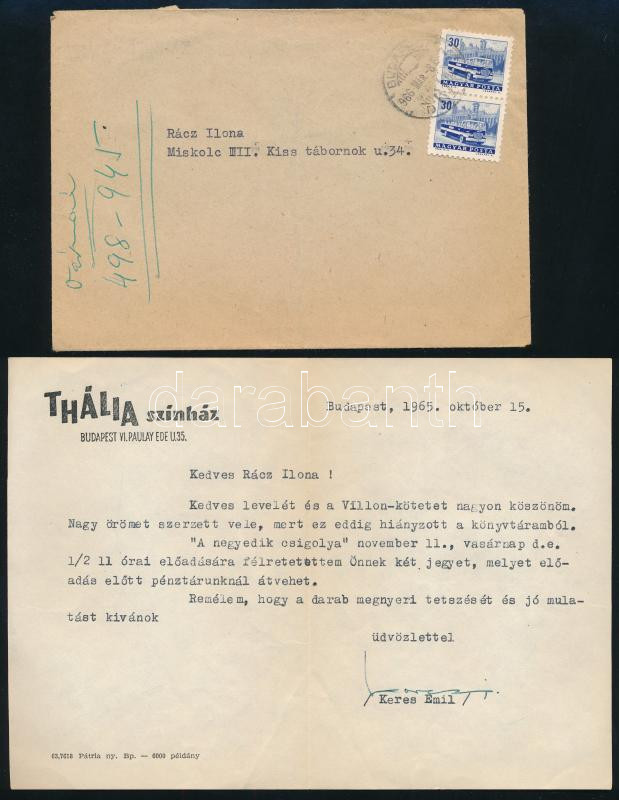 Beschreibung: 1965 Keres Emil (1925-2016) színész, színházigazgató saját kézzel aláírt, gépelt gratulációja a Thalia levélpapírján