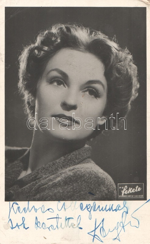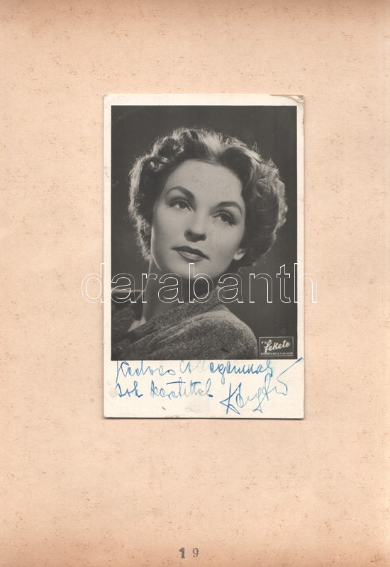 Déry Sári (1911-1952) színésznő dedikált fényképe: ,,Kedves csillagomnak sok szeretettel Déry Sári". A Fekete műterem fotója, mérete: 140x85 mm, egy 245x175 mm-es kartonlapra ragasztva.