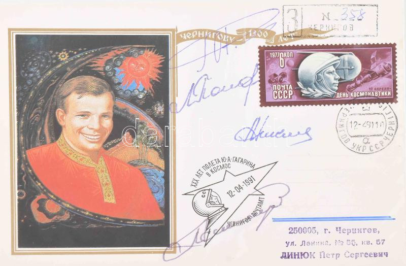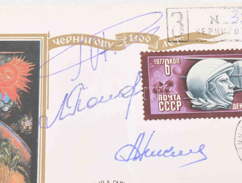 Jurij Viktorovics Romanyenko (1944- ), Adrijan Nyikolajev (1929-2004), Pavel Popovics (1930-2009) és Leonyid Popov (1945- ) szovjet űrhajósok aláírásai emlékborítékon / Signatures of Yuriy Viktorovich Romanenko (1944- ), Adriyan Nikolayev (1929-2004), Pavel Popovich (1930-2009) and Leonid Popov (1945- ) Soviet astronauts on envelope