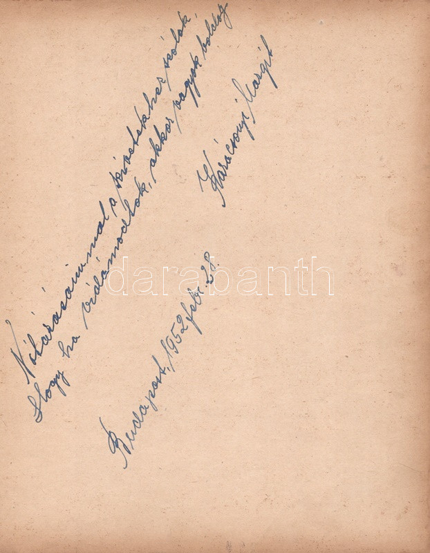 Karácsonyi Margit országos hÃrű nótaénekesnÅ‘, "a rádió népszerű kedvence, aki a kÃvánsághangversenyek ünnepelt sztárja" autográf sorai egy 245x192 mm-es papÃrlapon: ,,Nótázásaimmal a szÃvetekhez szólok, Hogy ha vidámodtok, akkor vagyok boldog. Budapest, 1952. febr. 28. Karácsonyi Margit".