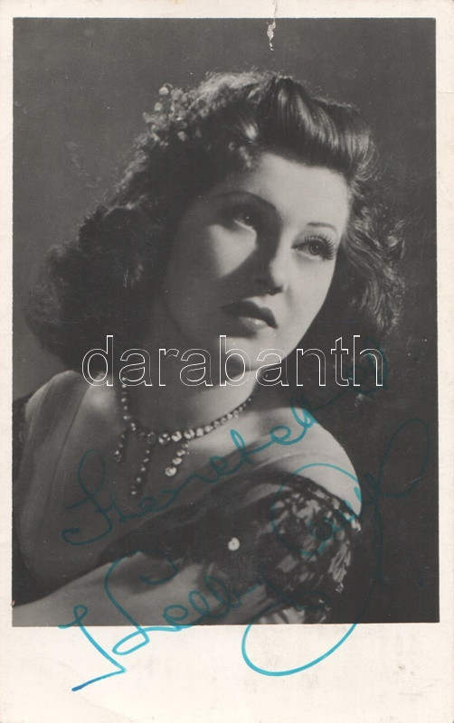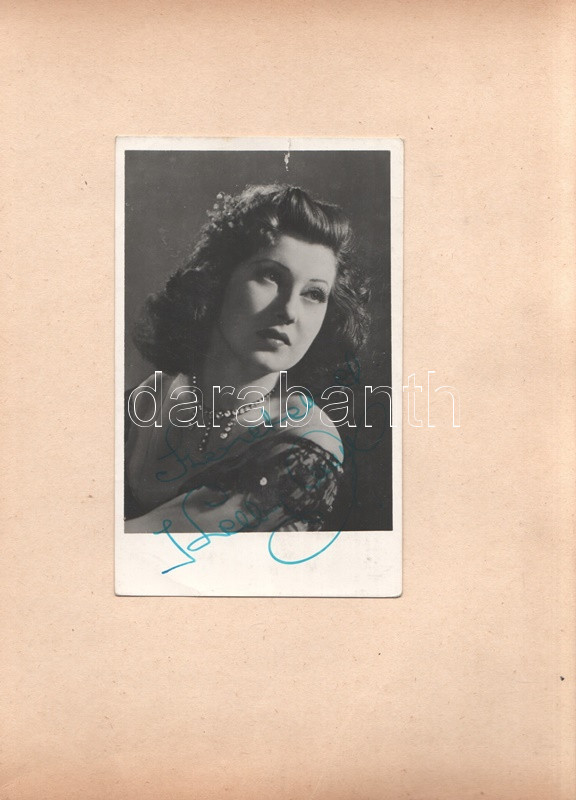 Kelly Anna (1919-1965) az 1940-es évek sikeres énekesnője dedikált fényképe: ,,szeretettel Kelly Anna". Mérete: 135x85 mm, egy 245x175 mm-es kartonlapra ragasztva. A fotó felső margóján apró repedés.