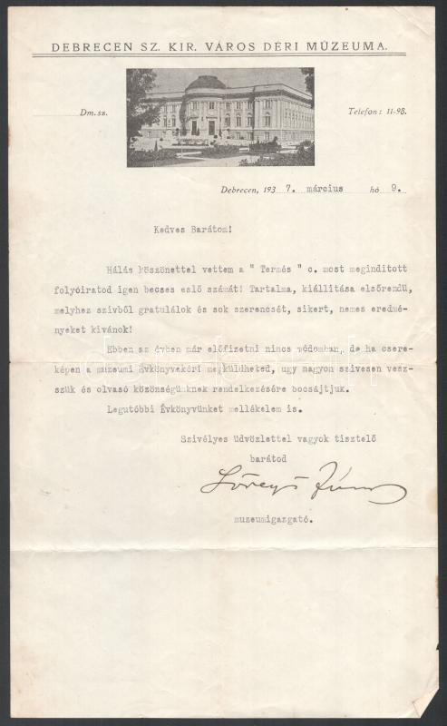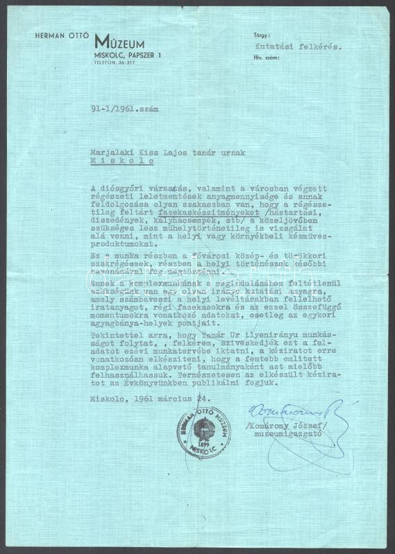 Két múzeumigazgató Sőregi János (1892-1982) Debreceni Múzeum és Komáromy József (1907-1973) Miskolc, Hermann Ottó Múzeum aláírásai fejléces levélpapíokron