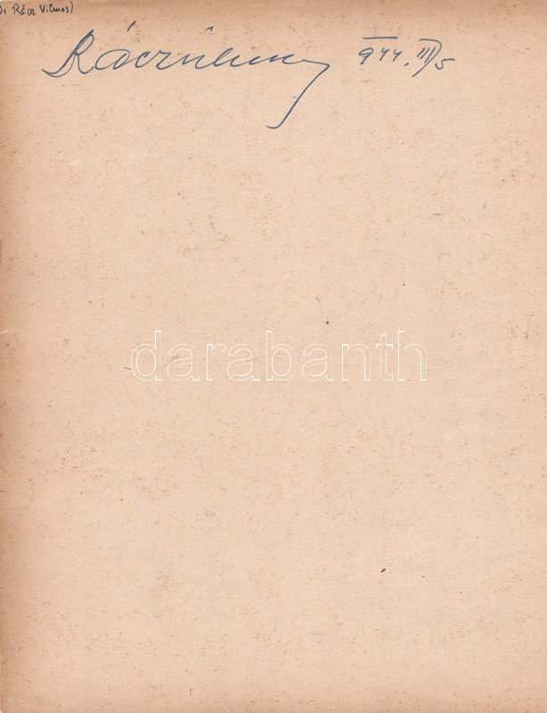 Rácz Vilmos (1889-1976): újságíró, atléta olimpikon autográf aláírása és datálása: ,,944. III/5." egy 245x190 mm-es papírlapon. Rácz 1944-ben a Színházi Magazin szerkesztője és kiadója volt, cikkei jelentek meg a Nemzeti Újság, Az Est, a Pesti Napló és a Magyar Nemzet című napilapokban. Párbajkódexe tette közismertté nevét, 1955-ben kivándorolt Új-Zélandba.