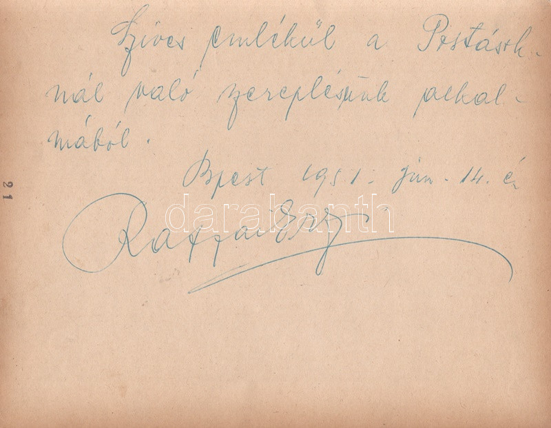 Raffay Erzsi (1913-2006) magyar opera-, operetténekes és színésznő, autográf sorai egy 245x190 mm-es papírlapon: ,,Szíves emlékül a Postásoknál való szereplésünk alkalmából. Bpest, 1951. jún. 14-én, Raffai Erzsi".