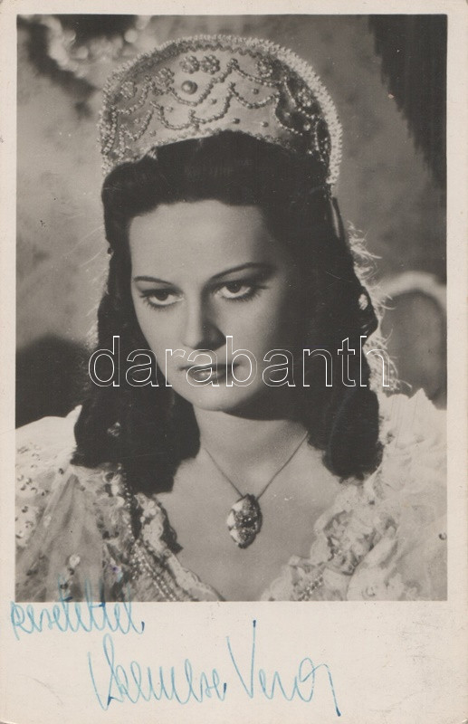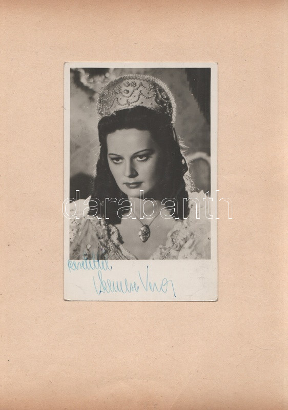 Szemere Vera (1923-1995) színésznő dedikált fényképe: ,,szeretettel Szemere Vera". Mérete: 140x90 mm, egy 245x171 mm-es kartonlapra ragasztva. A fotó Déryné szerepében ábrázolja a fiatal művésznőt.