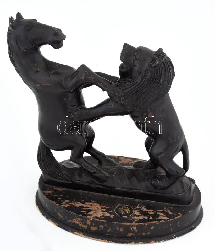 Lóra támadó oroszlán. Faragott és pácolt fa, cca 19. sz. vége, Nyugat-Európa, kopással, m: 27,5 cm