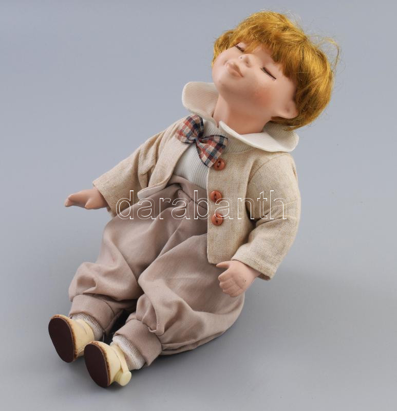 Beschreibung: Porcelánfejű csokornyakkendős baba, h: 26 cm
