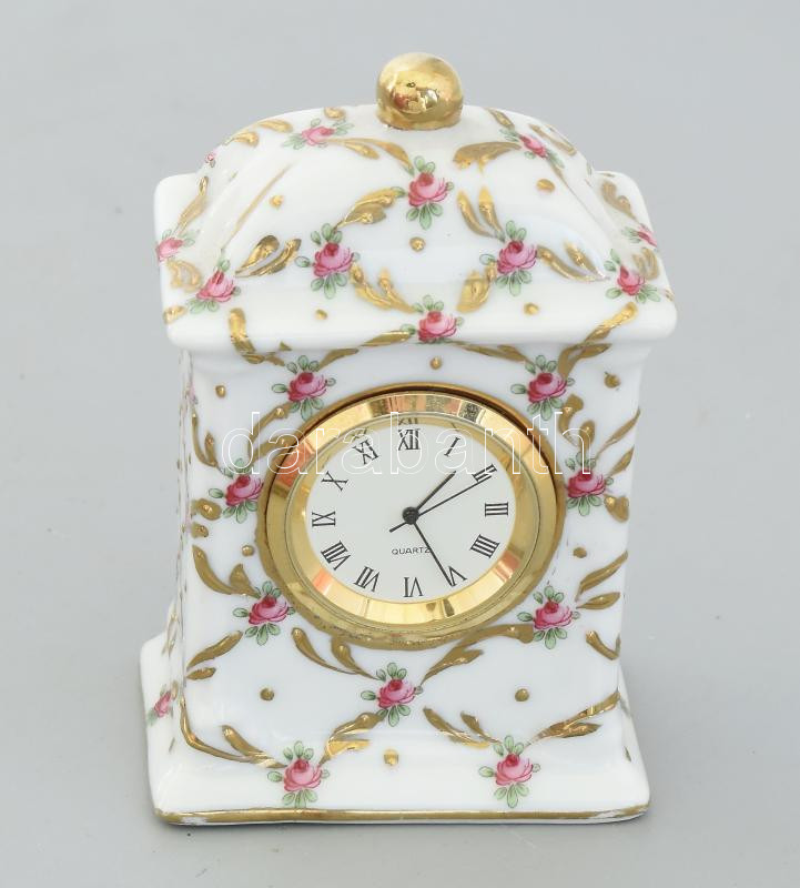 Beschreibung: Orchid Designs angol porcelán asztali óra, kézzel festett mintával, kvarc szerkezettel. Jelzett, kis kopással, m: 9,5 cm