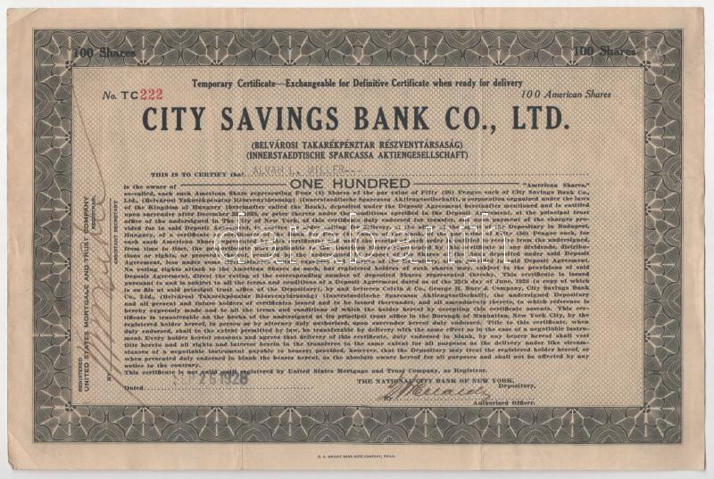 USA / New York 1928. "City Savings Bank Co., Ltd. (Belvárosi Takarékpénztár Részvénytársaság)" temporary certificate about 100 pcs of shares in one C:F
