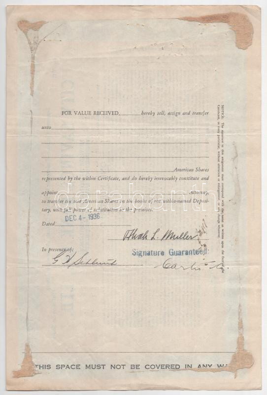 Amerikai Egyesült Államok / New York 1928. "City Savings Bank Co., Ltd. (Belvárosi Takarékpénztár Részvénytársaság)" ideiglenes elismervénye 100db részvényről egyben T:F