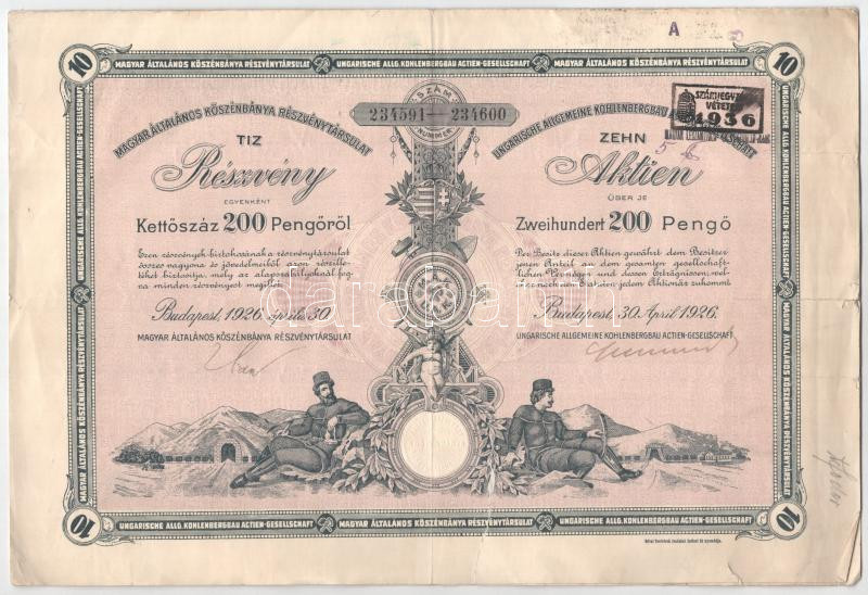 Budapest 1926. "Magyar Általános Kőszénbánya Részvénytársulat" tíz részvénye egyben, egyenként 200P-ről, magyar és német nyelven, bélyegzésekkel, szárazpecséttel T:F szakadás