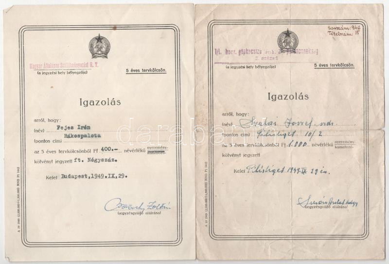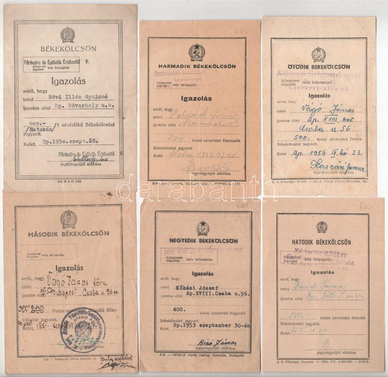Budapest 1949-1955. Kitöltött békekölcsön és tervkölcsön igazolások (8... https://www.darabanth.com/de/472-Fernauktion/472.0/Numismatik/Aktien-und-Tickets~2000006/Budapest-1949-1955-Kitoltott-bekekolcson-es-tervkolcson-igazolasok-8x-TF~II3194269
