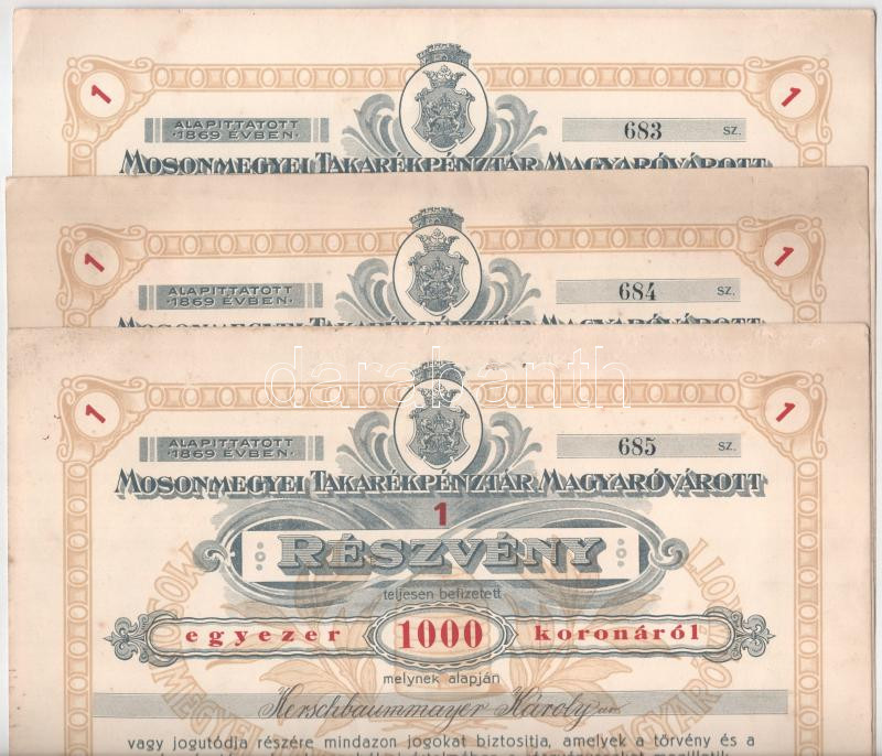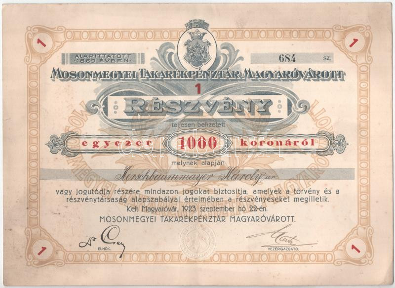 Magyaróvár 1923. "Mosonmegyei Takarékpénztár Magyaróvárott" ... https://www.darabanth.com/de/472-Fernauktion/472.0/Numismatik/Aktien-und-Tickets~2000006/Magyarovar-1923-Mosonmegyei-Takarekpenztar-Magyarovarott-reszvenye-1000K-rol-szarazpe~II3201835