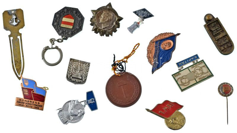 13db-os, főleg külföldi jelvényből álló tétel, közte NDK ~1950. "Wilhelm Pieck" kétoldalas jelzett meisseni porcelán emlékérem az NDK első címerével, átfúrva (37mm) T:AU-VF