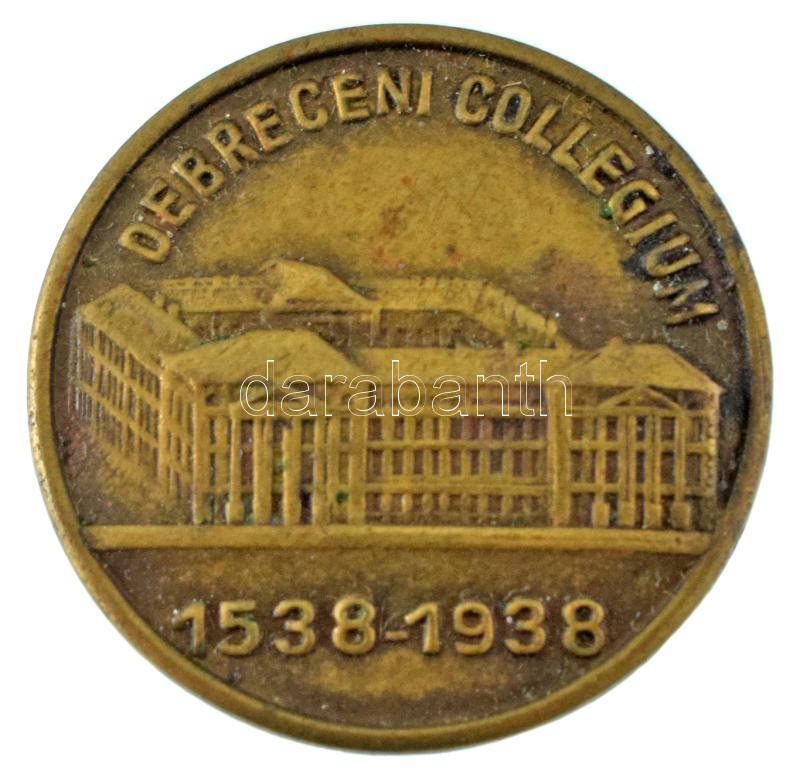 1938. "Debreceni Collegium 1538-1938" a Debreceni Református Kollégium fennállásnak 400. évfordulójára készült bronz gomblyukjelvény (23mm) T:AU