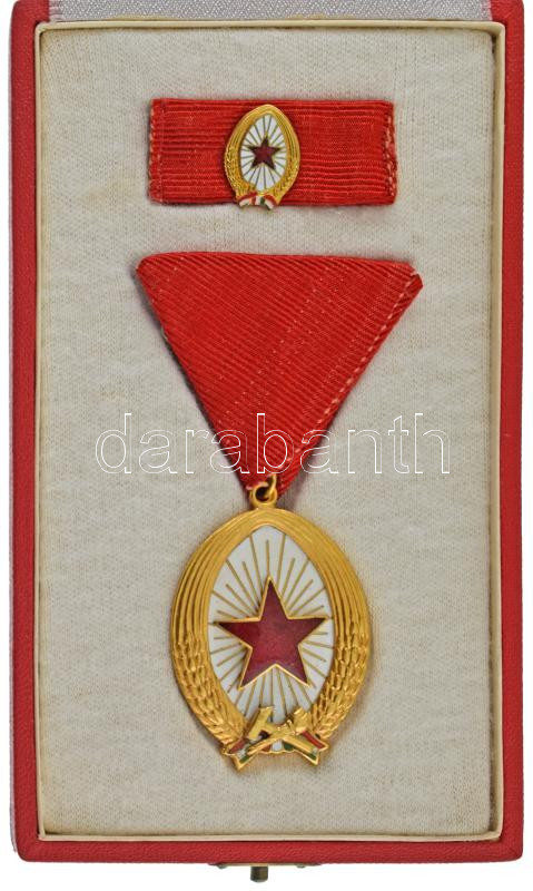 1954. "A Munka Érdemrend" arany fokozata, aranyozott, zománcozott bronz kitüntetés mellszalagon, eredeti tokban T:AU,XF Hungary 1954. "Hungarian Order of Labour - Gold Grade" gilt, enamelled bronze decoration on ribbon, in original case C:AU,XF NMK 598.b