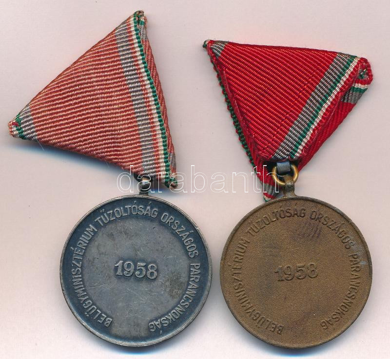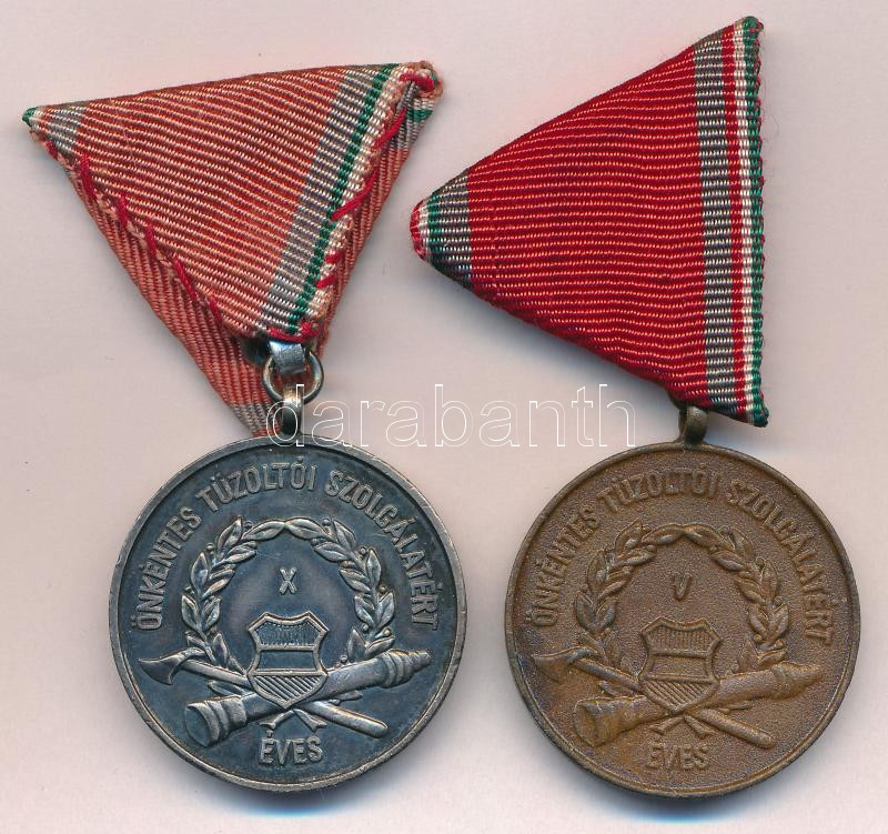 1958. "V Éves Önkéntes Tűzoltói Szolgálatért" bronz kitüntetés, eredeti mellszalagon + "X Éves Önkéntes Tűzoltói Szolgálatért" ezüstpatinázott kitüntetés, eredeti mellszalagon T:AU,XF