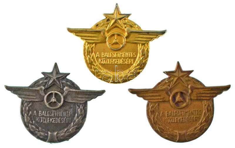 Beschreibung: ~1960. "A Balesetmentes Közlekedésért" jelvény arany, ezüst és bronz fokozatai (24x30mm) T:AU