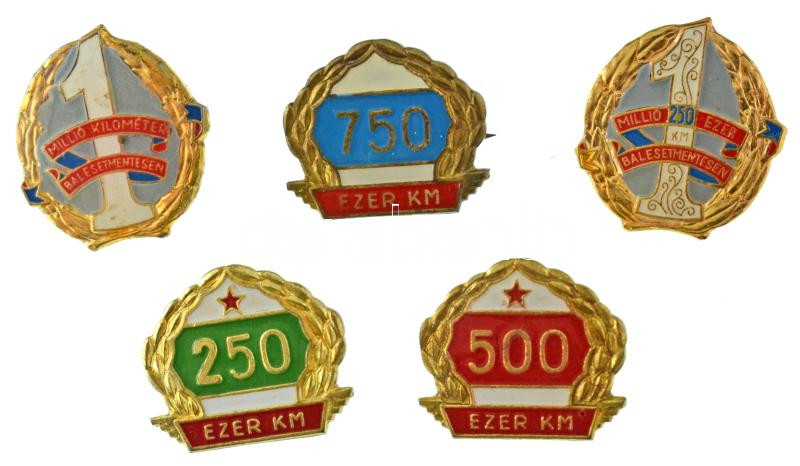 ~1980. Balesetmentes vezetésért járó, műgyantás kitüntető jelvény 250 ezer, 500 ezer, 750 ezer, 1 millió és 1 millió 250 ezer kilométer után (5xklf) T:AU