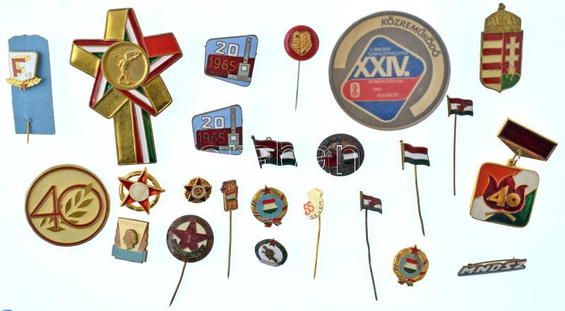 Beschreibung: ~25db-os vegyes kitűző és jelvény tétel, közte 1965. "Vöröskő 20 - 1965" zománcozott bronz kitűző (~23x21mm) T:vegyes, több darabról hiányzik a tű