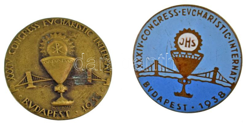 Madarassy Walter (1909-1994) 1938. "XXXIV. Nemzetközi Eucharisztikus Kongresszus Budapest" 2xklf, bronz és zománcozott bronz jelvény (23mm) T:AU