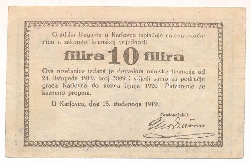 Yugoslavia / Kingdom of the Serbs, Croats and Slovenes / Karlovac 1919. 10 Filira C:F fine paper