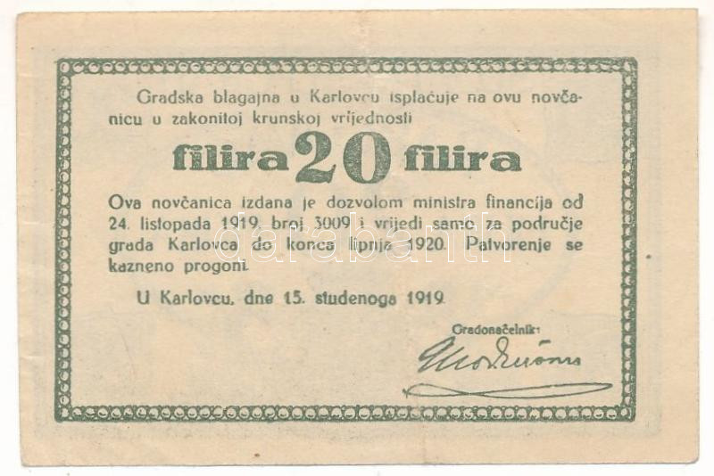 Yugoslavia / Kingdom of the Serbs, Croats and Slovenes / Karlovac 1919. 20 Filira C:F fine paper