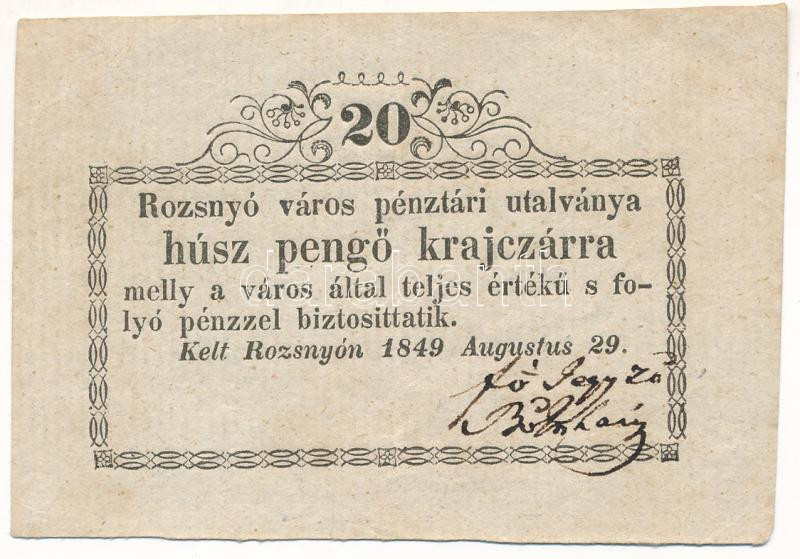 Rozsnyó 1849. 20kr "Rozsnyó város pénztári utalványa" T:F szép papír Hungary / Rozsnyó 1849. 20 Kreuzer "Rozsnyó bánya város pénztári utalványa (Cashier's Coupon of Mine Town of Roznava)" C:F nice paper Adamo ROZ-2.1