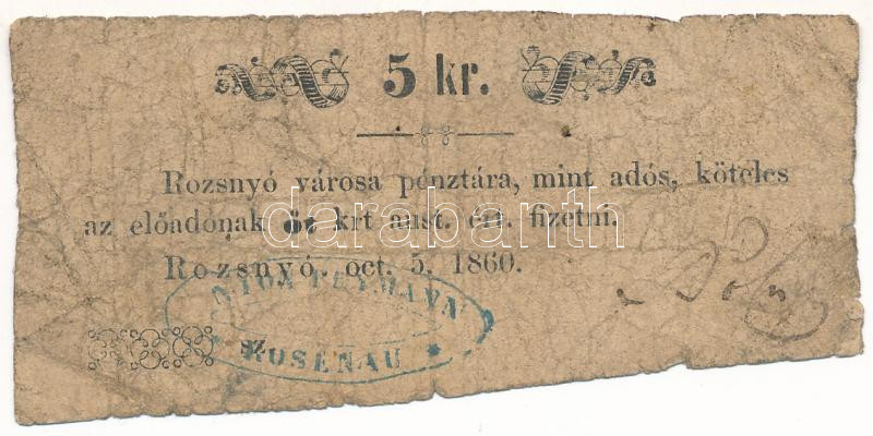 Beschreibung: Rozsnyó 1860. 5kr "Rozsnyó város pénztára, mint adós" T:VG,G Adamo ROZ-3.1.2